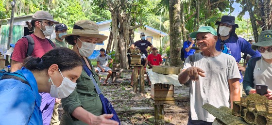 Thiago Gouvêa, CST group leader, joins other participants of the AmazonIA – Mamirauá Meeting in visiting a riverside family engaged in sustainable honey production in the Amazon.
